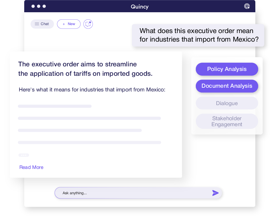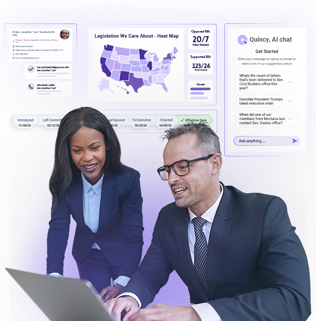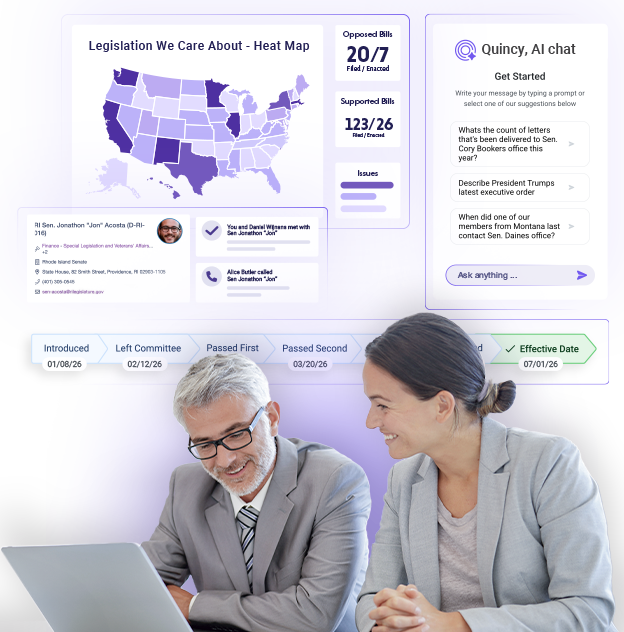 Increase your policy wins, understand your policy landscape, and build a unified data-driven strategy — supercharged with Quincy, your patented AI assistant that accelerates analysis, surfaces insights, and simplifies execution.