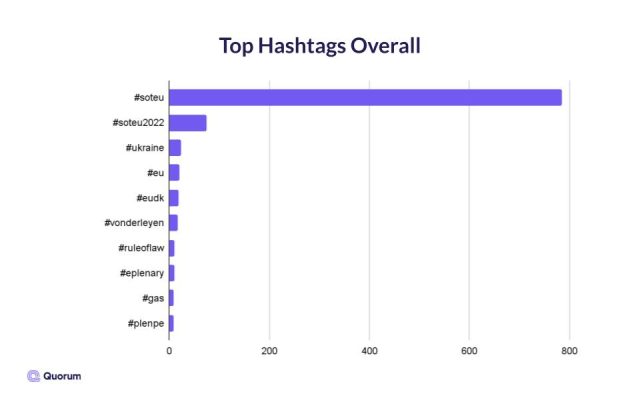 From the speech content, to Olena Zelenska as guest of honour, and even the blue-and-yellow outfits seen in the hemicycle — Ukraine was the clear focus of Wednesday’s proceedings. So, it’s no surprise to see that #ukraine was the most-used hashtag after #soteu and #soteu2022.