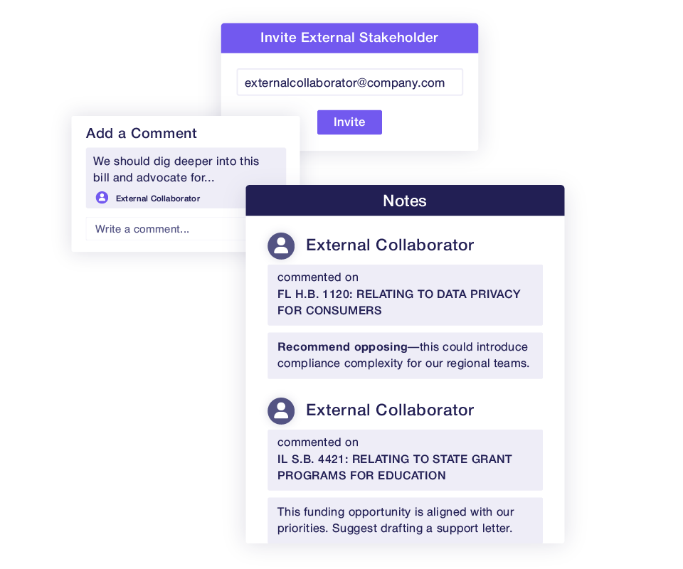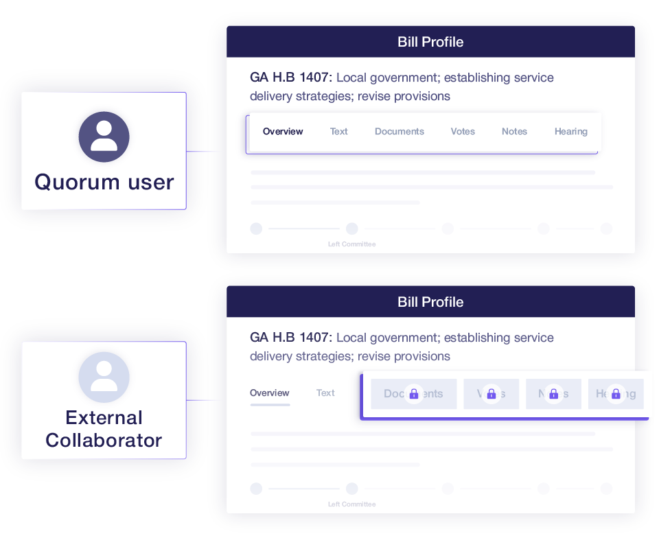 Give lobbyists, legal teams, consultants and SMEs limited access to assigned bills—without exposing internal data.