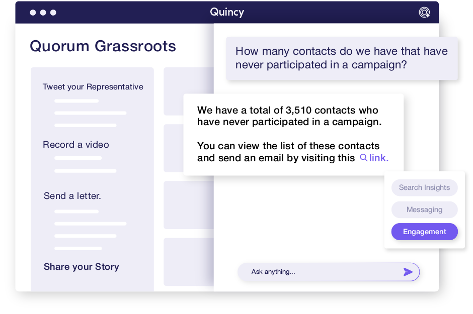 Accelerate your grassroots workflow with Quincy, Quorum’s AI Assistant. Instantly surface advocate engagement trends, campaign performance insights, and participation patterns with natural-language search—no filters or digging required. Pair that insight with AI-powered outreach tools to create personalized messages quickly and at scale across campaigns.