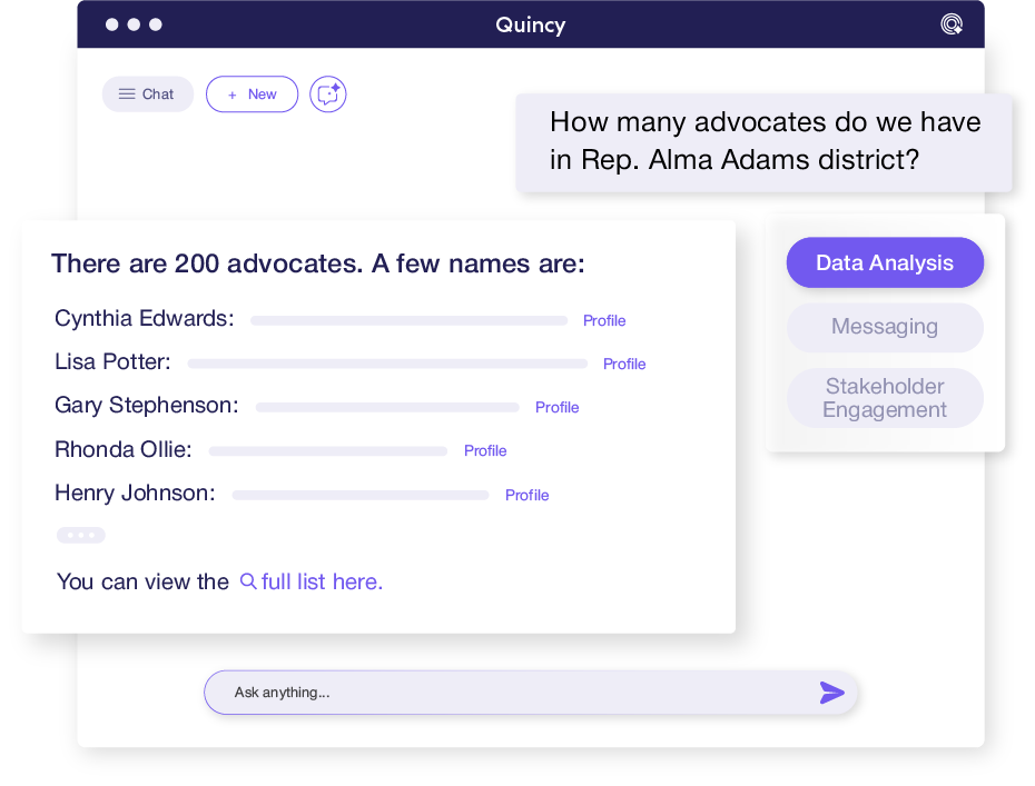 Put AI to work for your grassroots strategy. Instantly uncover insights on advocate behavior, campaign performance, and issue resonance through natural-language search and intelligent recommendations, helping you refine strategy, personalize outreach, and stay ahead of what’s next.