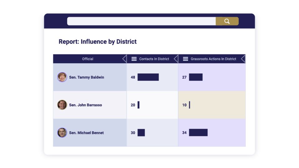 Without the only unified public affairs platform, you miss an opportunity to influence people who can move policy. See the effects of your combined grassroots and lobbying efforts by legislative district and strategize how your teams can work together to influence legislative outcomes.
