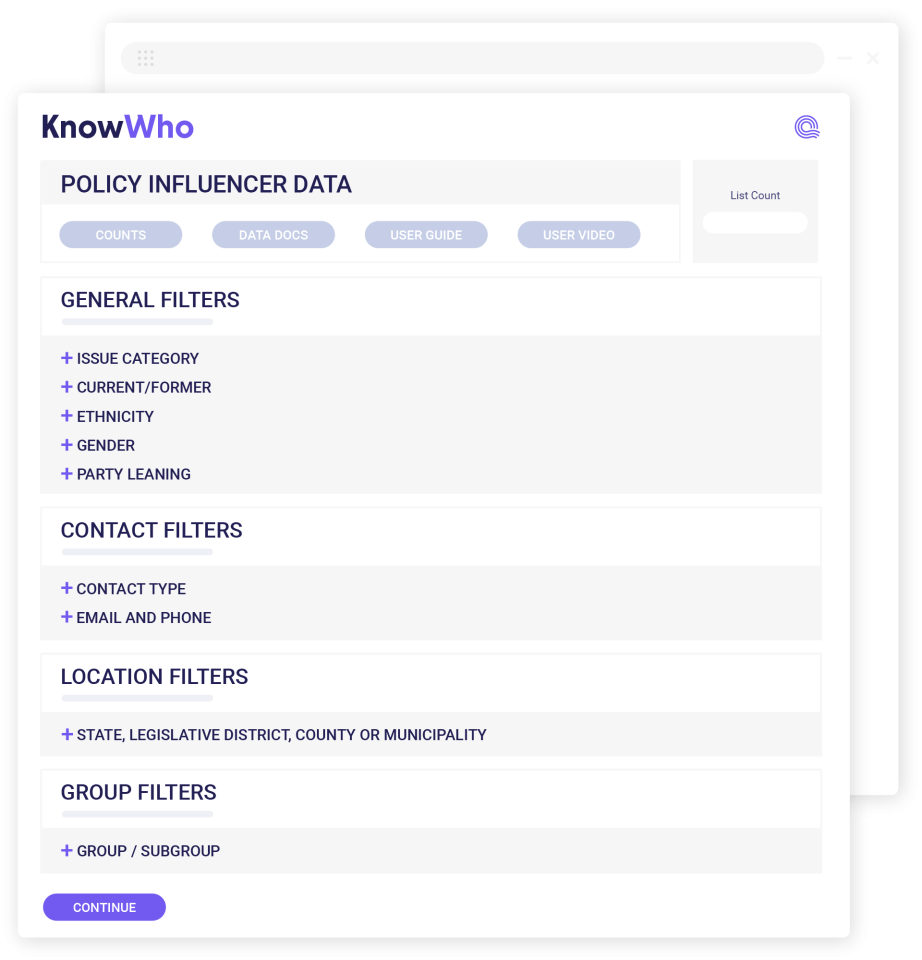 Layer KnowWho’s influencer data with your own CRM records and apply filters like issue interest, party leaning, gender, and ethnicity to build more targeted audience lists.