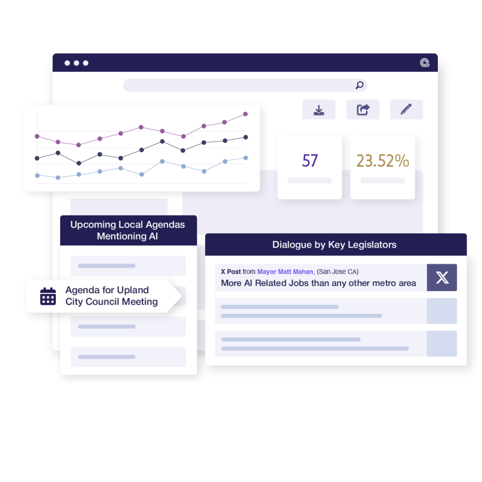 Understand your policy landscape with agenda tracking for municipal meetings in all counties and city populations of 3,000 or greater. AI scans and analyzes agendas and minutes, flagging relevant mentions, highlighting decisions, and surfacing key changes so you can stay ahead of local developments. Never miss a mention of how your organization and issues are being considered with custom alerts for social media dialogue.