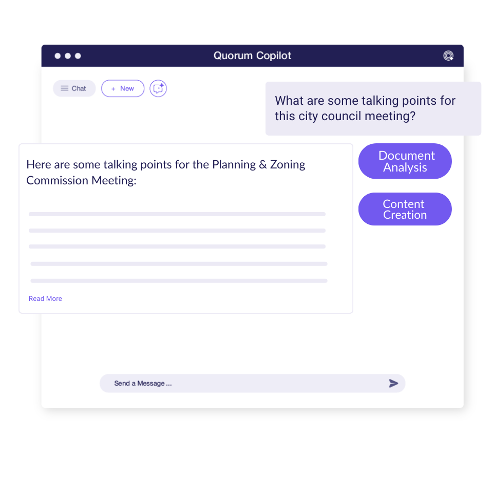 Bring speed and clarity to local engagement with Copilot’s patented AI. Instantly surface what matters in city and county agendas, including summarized decisions, key mentions, and emerging trends, using natural-language search. Quickly turn those insights into tailored content for internal updates, stakeholder briefings, or public testimony. No more digging through PDFs or missing critical developments.
