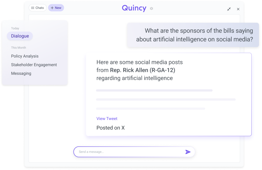 Go beyond speed to superior legislative intelligence. Quincy surfaces policy signals and relationship nuances you didn’t have before, empowering you to stay ahead, shape the dialogue, and drive meaningful impact while your competitors struggle to keep up.