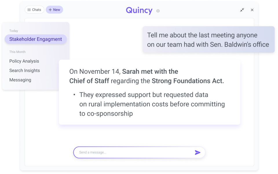 Unify intelligence across all spheres of influence by analyzing your team’s internal meeting notes directly within Quincy. Bridge the gap between public policy data and your private institutional knowledge, asking questions about your past interactions as easily as you ask about public bills.
