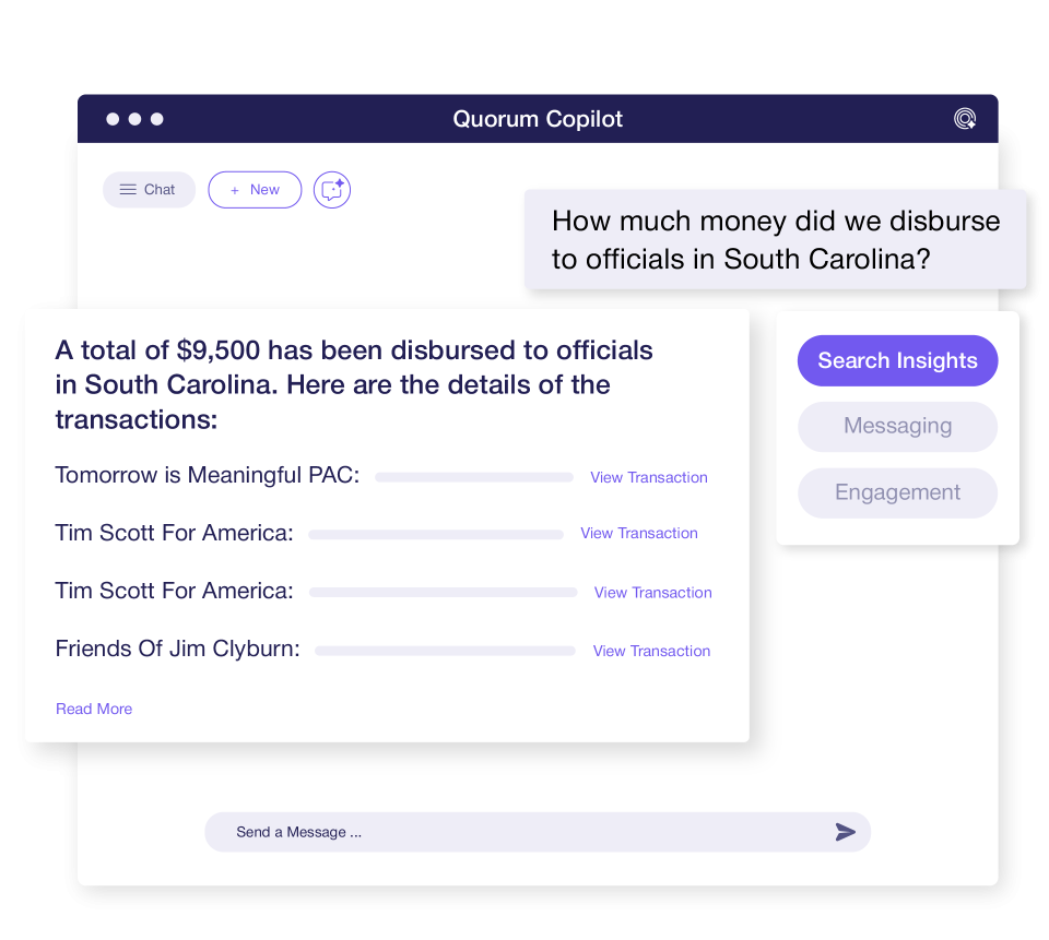 Accelerate decisions and outreach with Quorum Copilot’s patented AI. Instantly surface contribution trends, track donor engagement, and generate personalized solicitations, texts, and event invites to drive contributions faster.