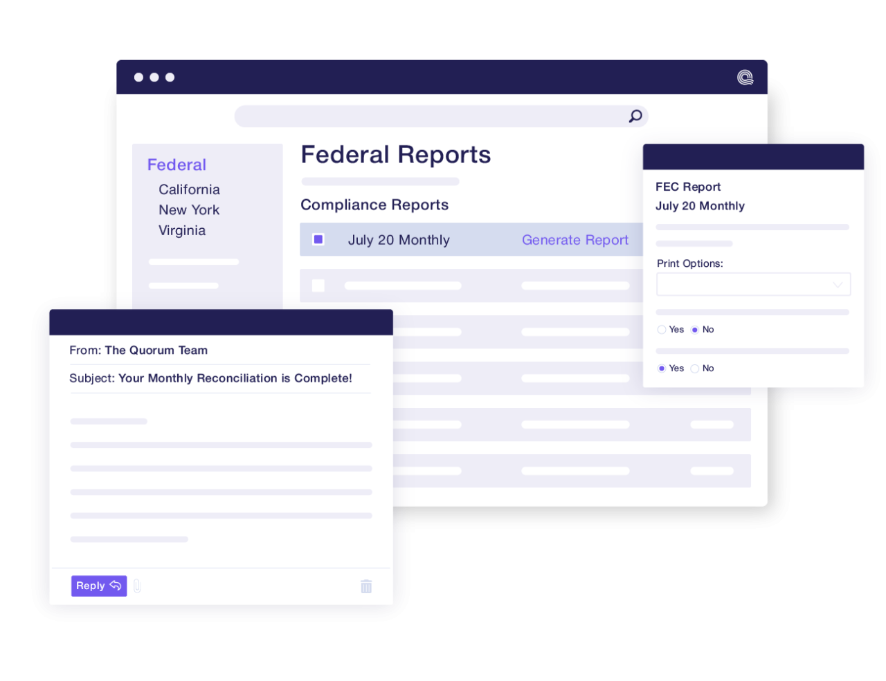 Whether you file with the FEC or with state election commissions, Quorum makes it easy to stay compliant. Manage transactions, reconcile accounts, and file reports for all of your PACs, all in just a few clicks.