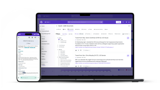 Receive real-time mobile and email alerts for mentions of your organization or issues across platforms like X (Twitter), Facebook, YouTube, committee hearings, and newsletters.